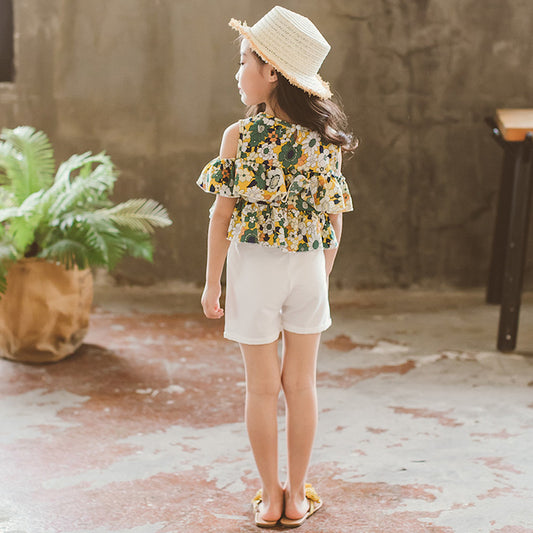 Mädchen-Set mit trägerlosem Kurzarm-T-Shirt mit Blumenmuster und weißen Shorts