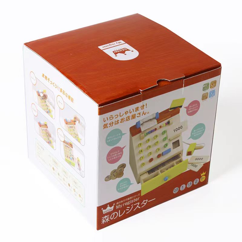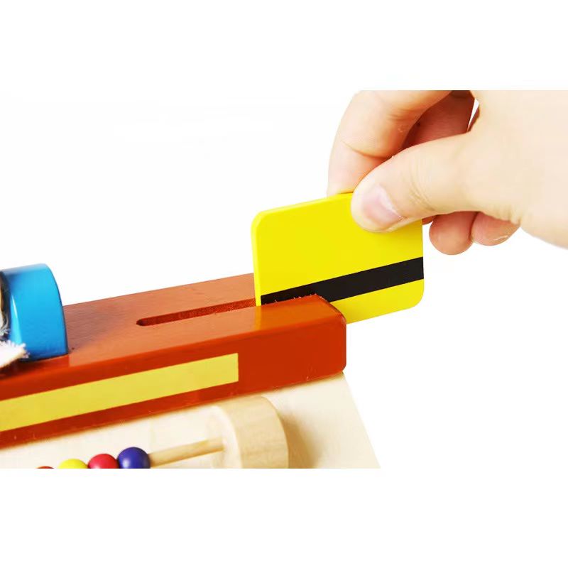 Caisse enregistreuse comprenant un tiroir caisse avec billets et pièces de monnaie. Une carte bancaire, un scanner, un rouleau de ticket de caisse en tissu scratché, etc.Jouet facile a manipuler et "pour faire comme les grands.