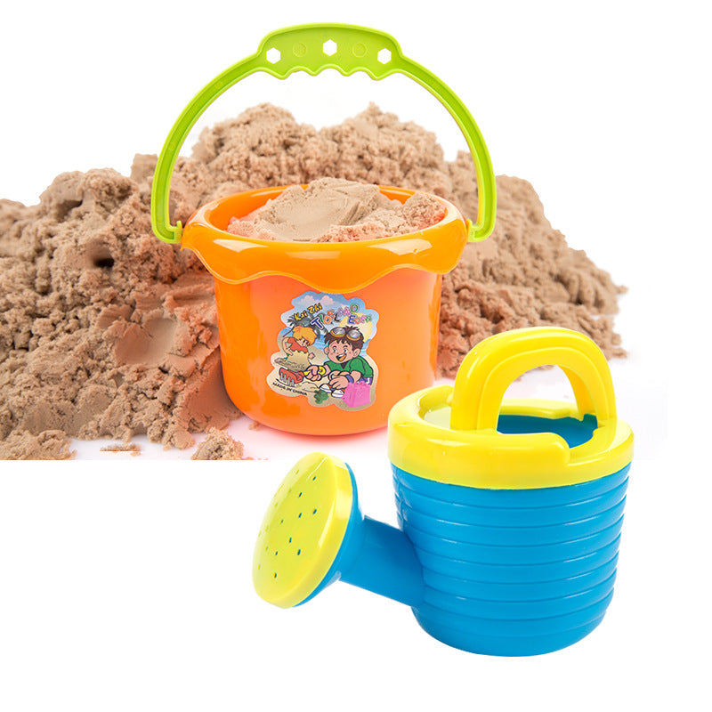 Un seau coloré, deux pelles (environ 16 cm de long), une cuillère (environ 16 cm de long), un rateau, une passoire, etc... un arrosoir, une paire de lunettes de soleil. Un total de neuf articles.