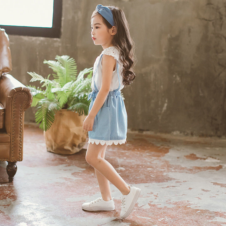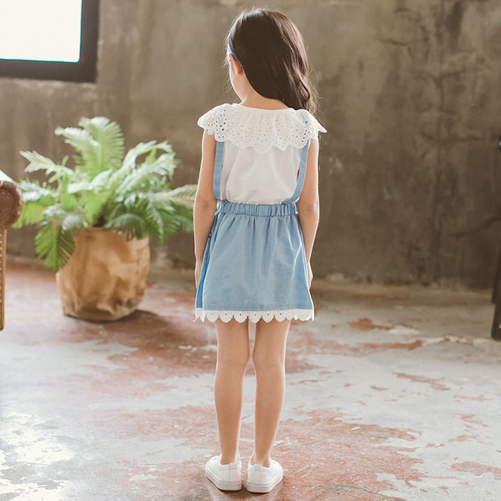 Joli petit ensemble pour fille avec un t-shirt en coton à col dentelle et une jupe en denim pour un look cool et confortable.