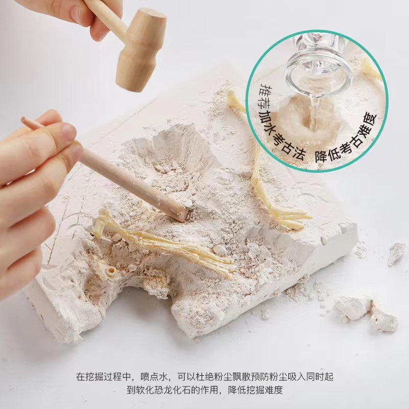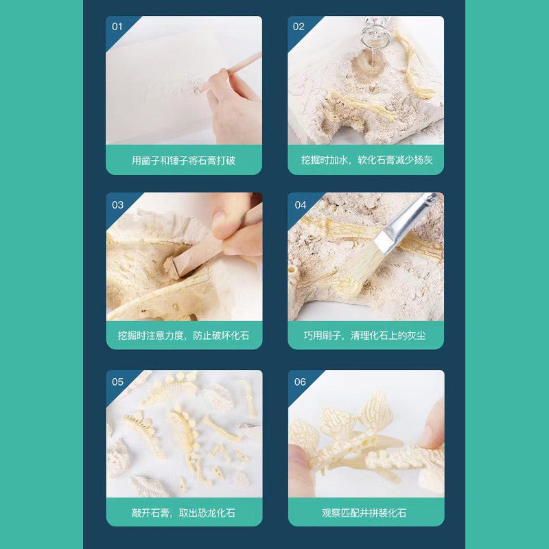 Jouer à l'archéologue, découvrir enfouis dans un bloc de roche les ossements d'un dinosaure puis reconstituer ce dernier. Quatres boites différentes avec chacune un dinosaure. Chaque boite contient 1 marteau, 1 burin et 1 pinceau pour effectuer les fouilles. Développe la patience et la précision des gestes. A partir de 6 ans