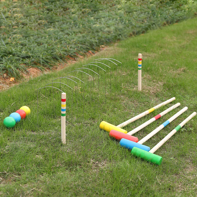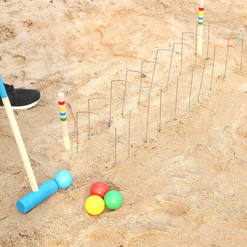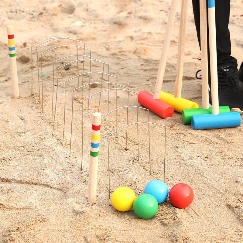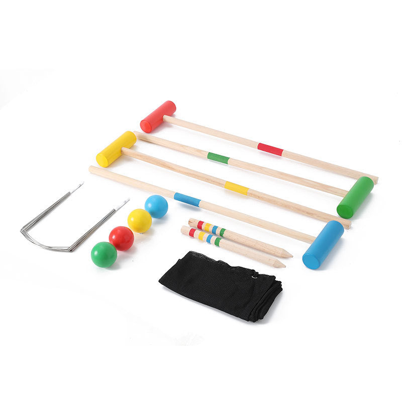 Jeu de croquet complet en bois avec 4 maillets, 4 boules de couleur, 2 piquets en bois, 10 arceaux en métal et un sac de rangement. Hauteur des maillets: 70cm, largeur de la base: 14 cm. Poids total du jeu: 2.300Kg