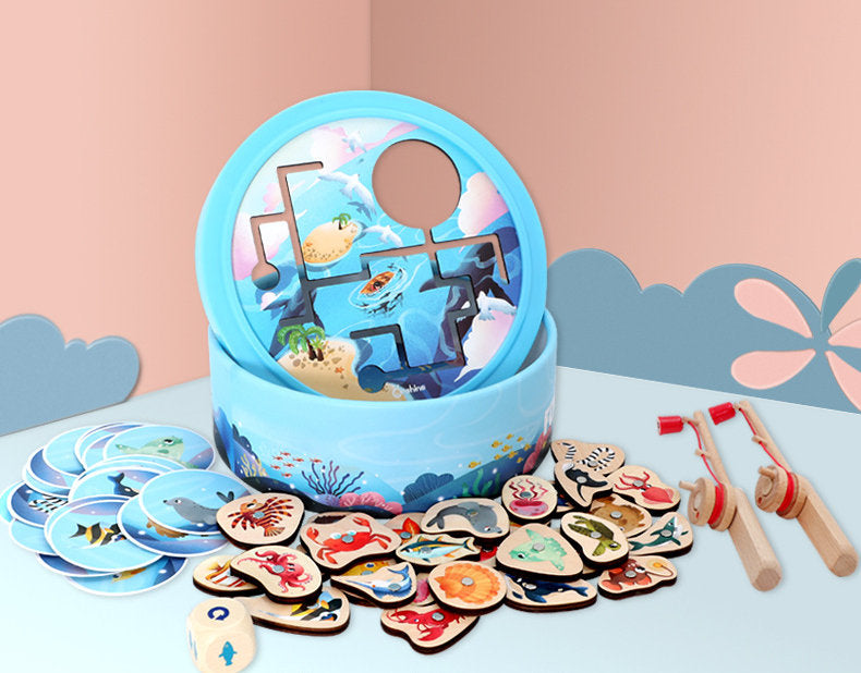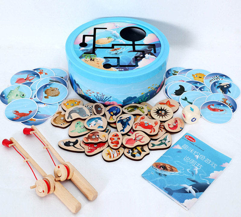 Labyrinthe de pêche magnétique jeu poisson pour enfant. Composé de 30 petits poissons et 30 cartes, deux cannes à pêche, et un dé. Chaque poisson possède une fiche de connaissances correspondante pour aider les parents et les enfants à mieux connaitre les poissons.