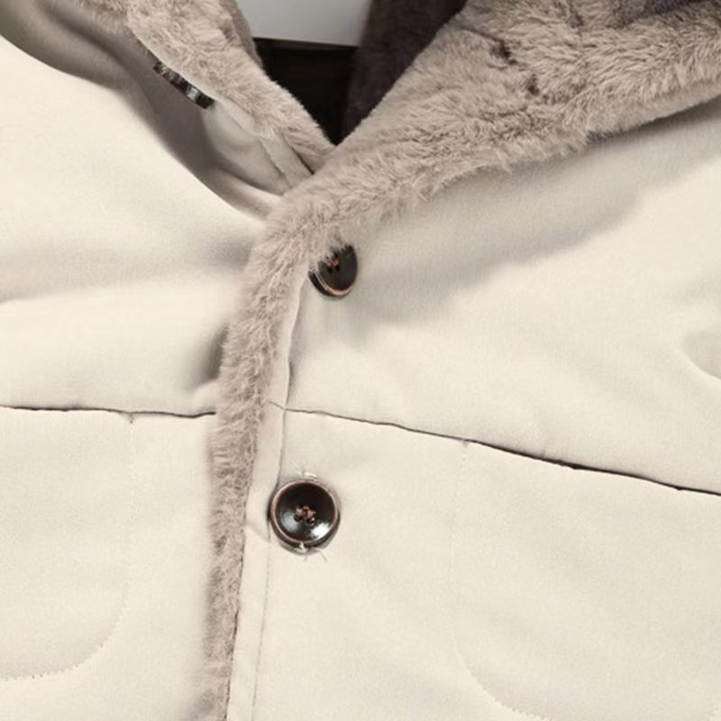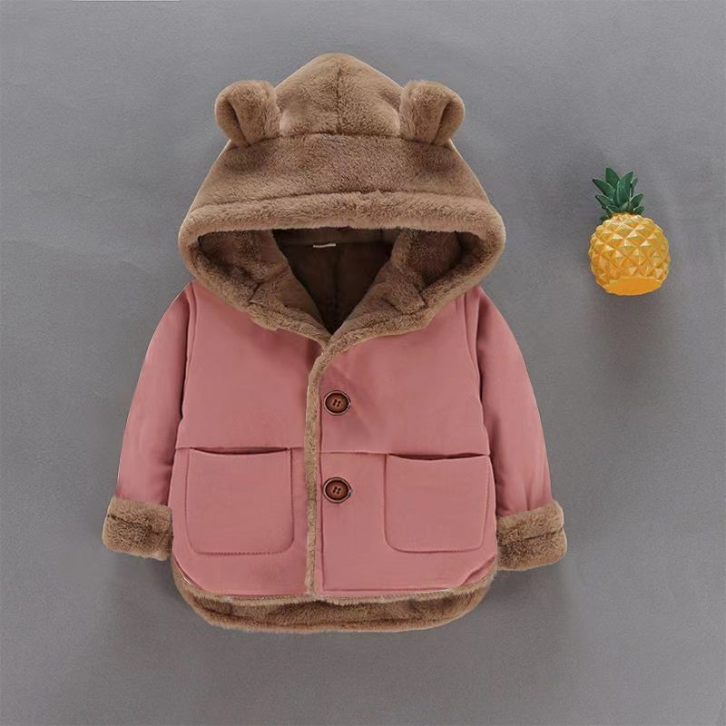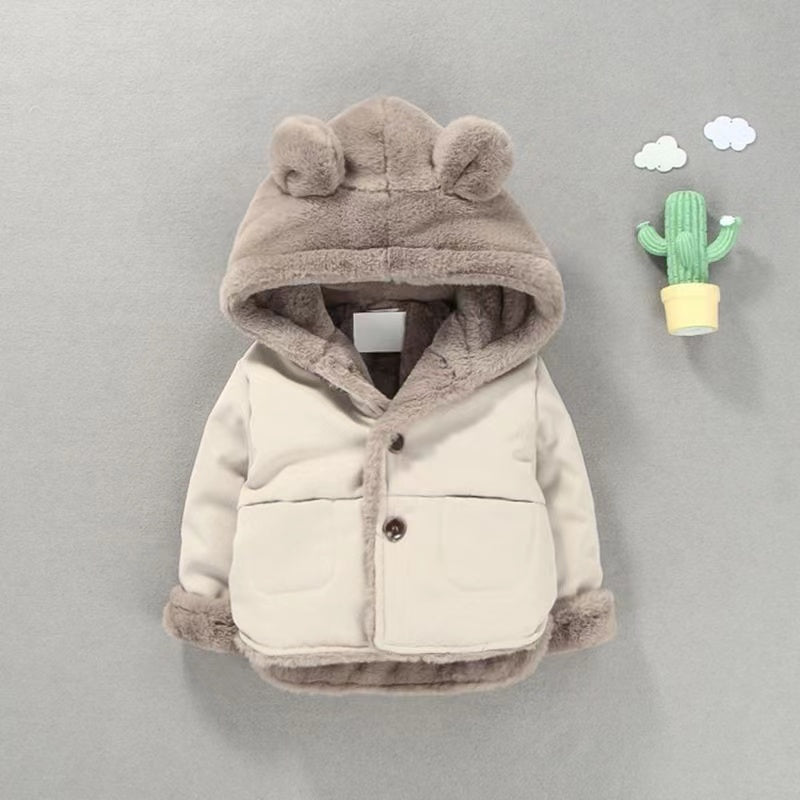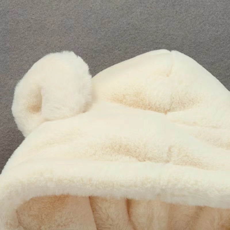 Petit manteau confortable et chaud pour bébé. Capuche en fourrure douillette avec des petites oreilles de panda. Tout doublé fourrure à l'interieur. Deux gros boutons sur le devant et 2 petites poches.