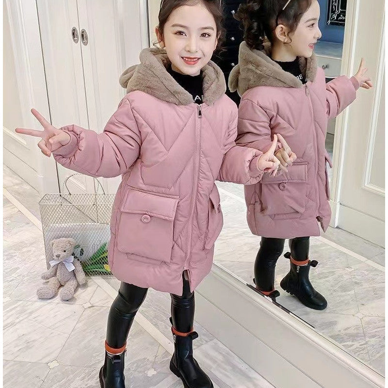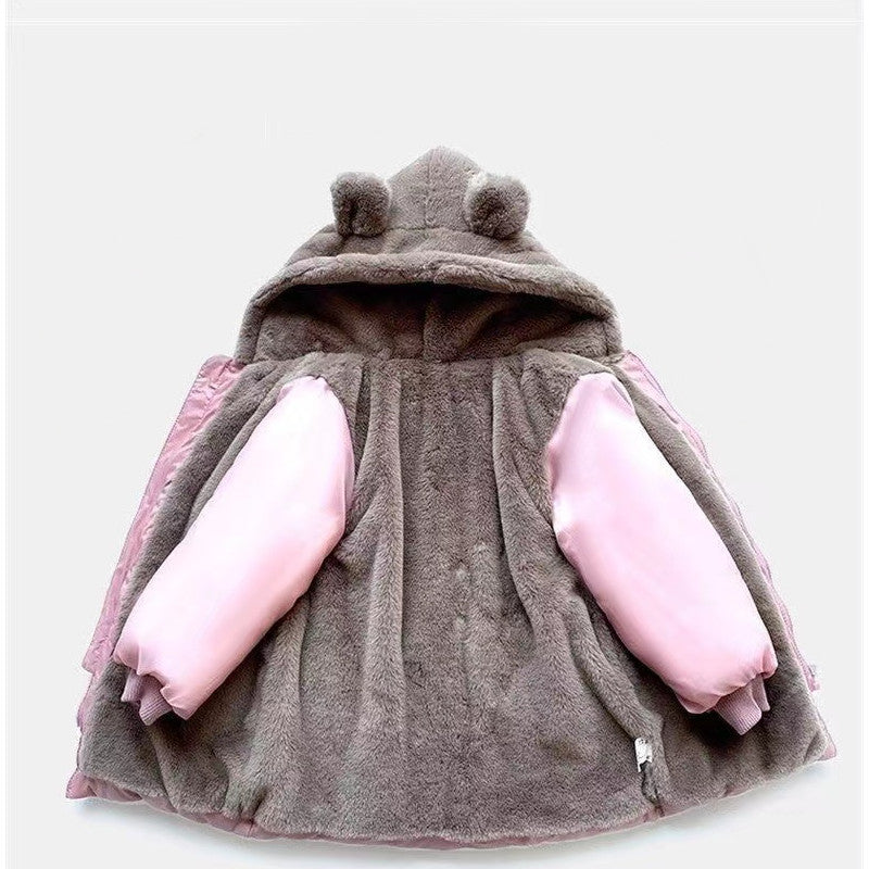 Joli manteau doudoune matelassé pour petite fille. la capuche en peluche avec oreilles de nounours est rigolote et stylée à la fois. 2 poches plaquées à revers, poignets élastiqués et fermeture zippée avec patte de protection pour plus de confort et de chaleur.