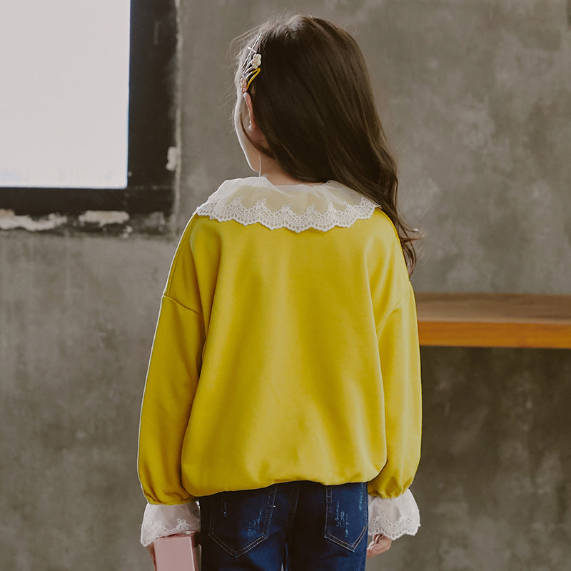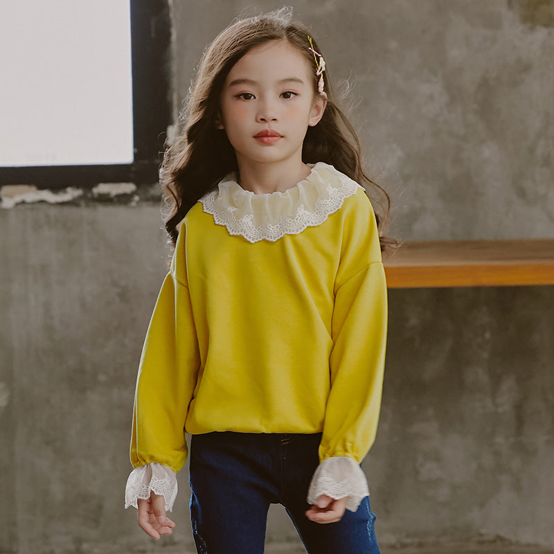 Pullover décontracté pour fille en coton avec col et manches en dentelle fine