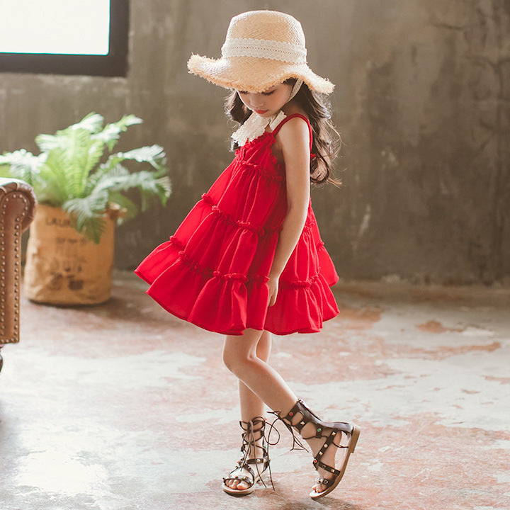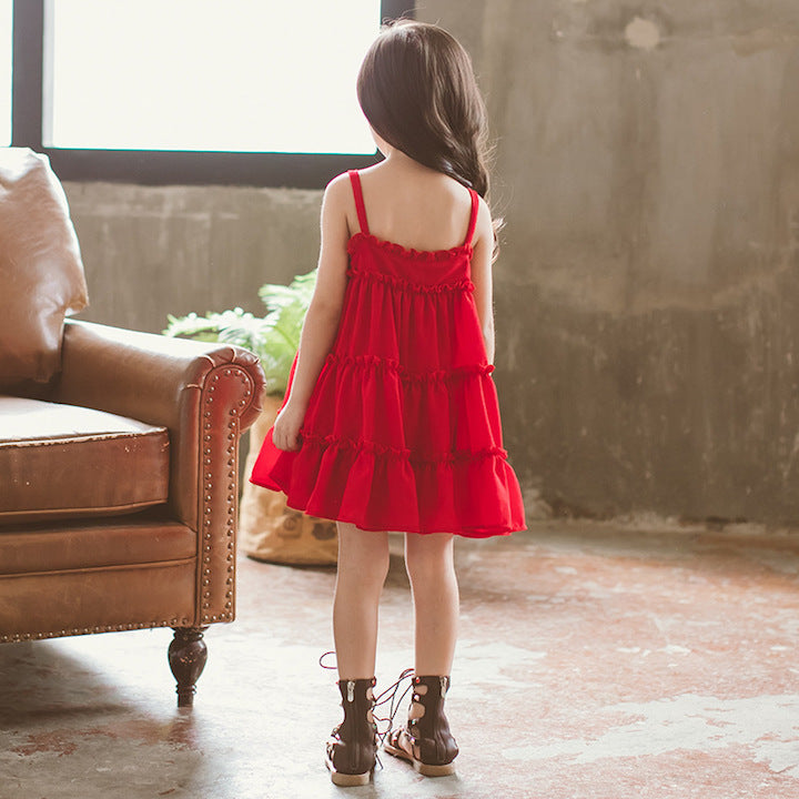 Magnifique petite robe rouge pour fille, idéale pour l’été et le printemps lorsqu’il fait chaud avec sa coupe ample et son tissu aéré. Bretelles fines, détails froufrous.