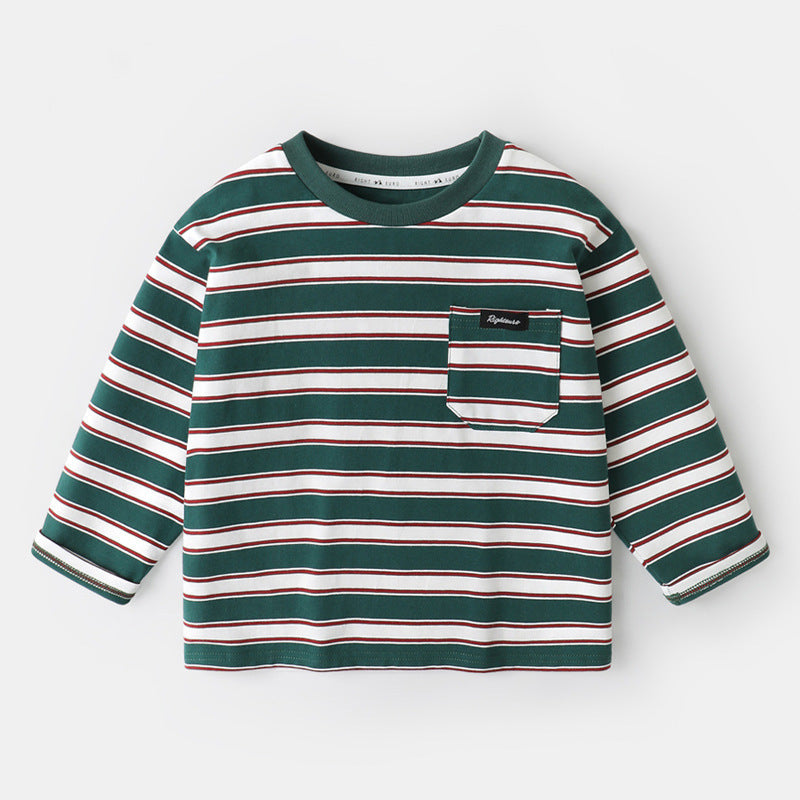 Ajoutez une touche de style à la garde-robe de votre garçon avec ce t-shirt rayé à manches longues. Conçu avec des rayures vertes classiques et un col rond, il allie confort et élégance.